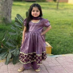 A soft lilac sheesha silk frock paired with a delicate net cape, adorned with elegant cur dana embellishments for a dreamy, graceful look.