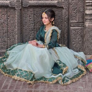 Elegant sheesha silk shirt paired with a crushed sharara and net dupatta, adorned with delicate lace detailing and subtle embellishments.