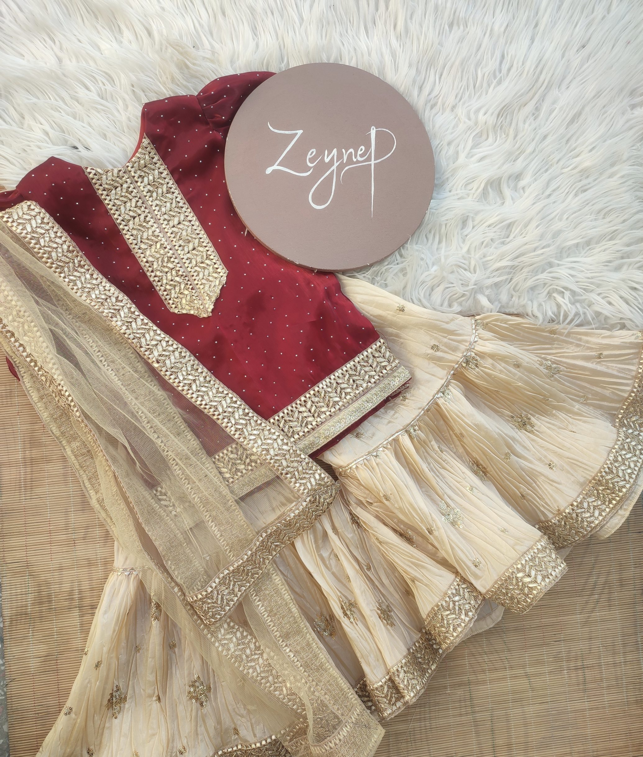 Product Description A statement crushed gharara paired with a sheesha silk shirt featuring elegant puffy sleeves, finished with a soft net dupatta. Graceful, festive, and timelessly charming.