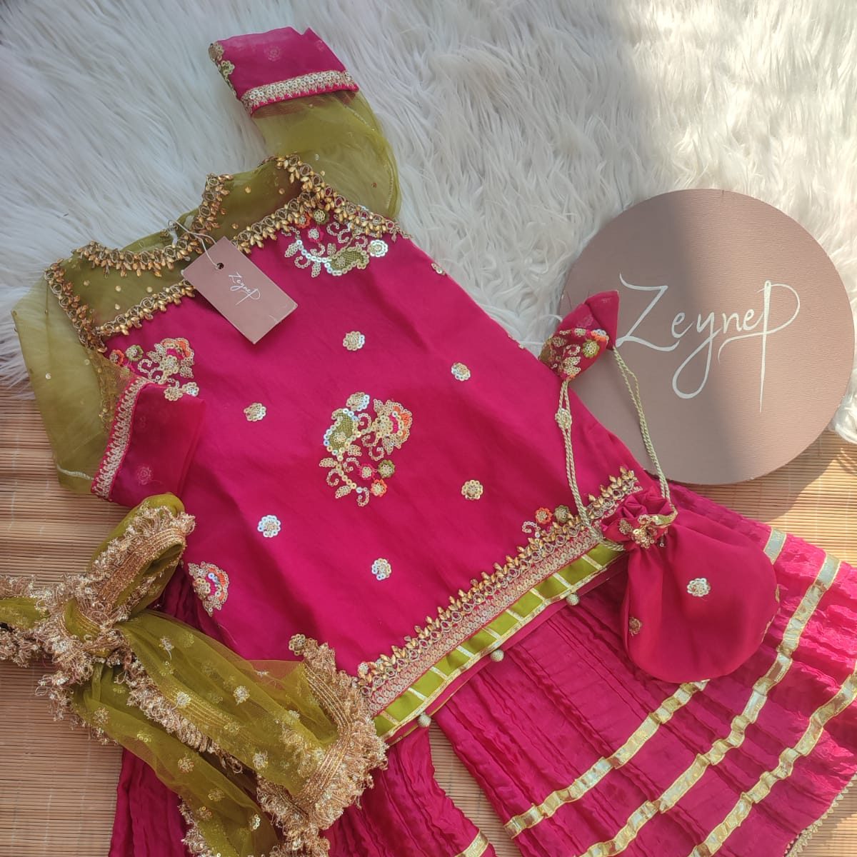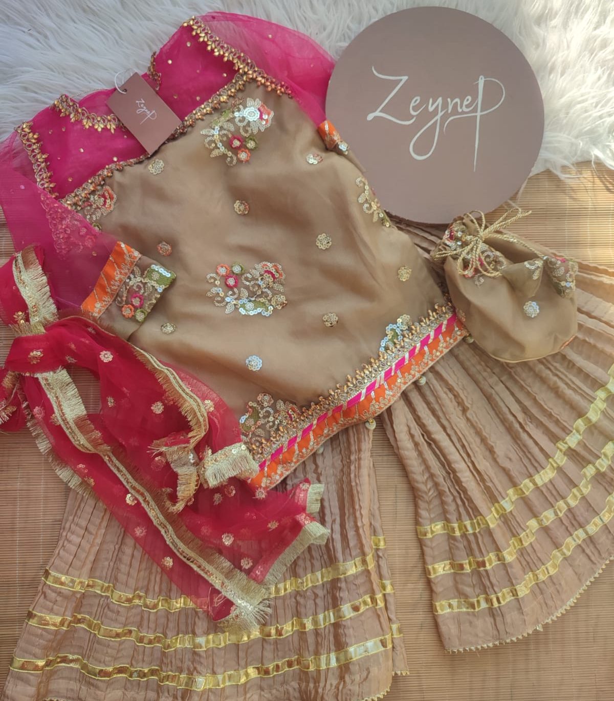 An elegant organza shirt with lace detailing on the front, net neckline and sleeves, paired with a raw silk crush sharara, net dupatta, and organza potli.
