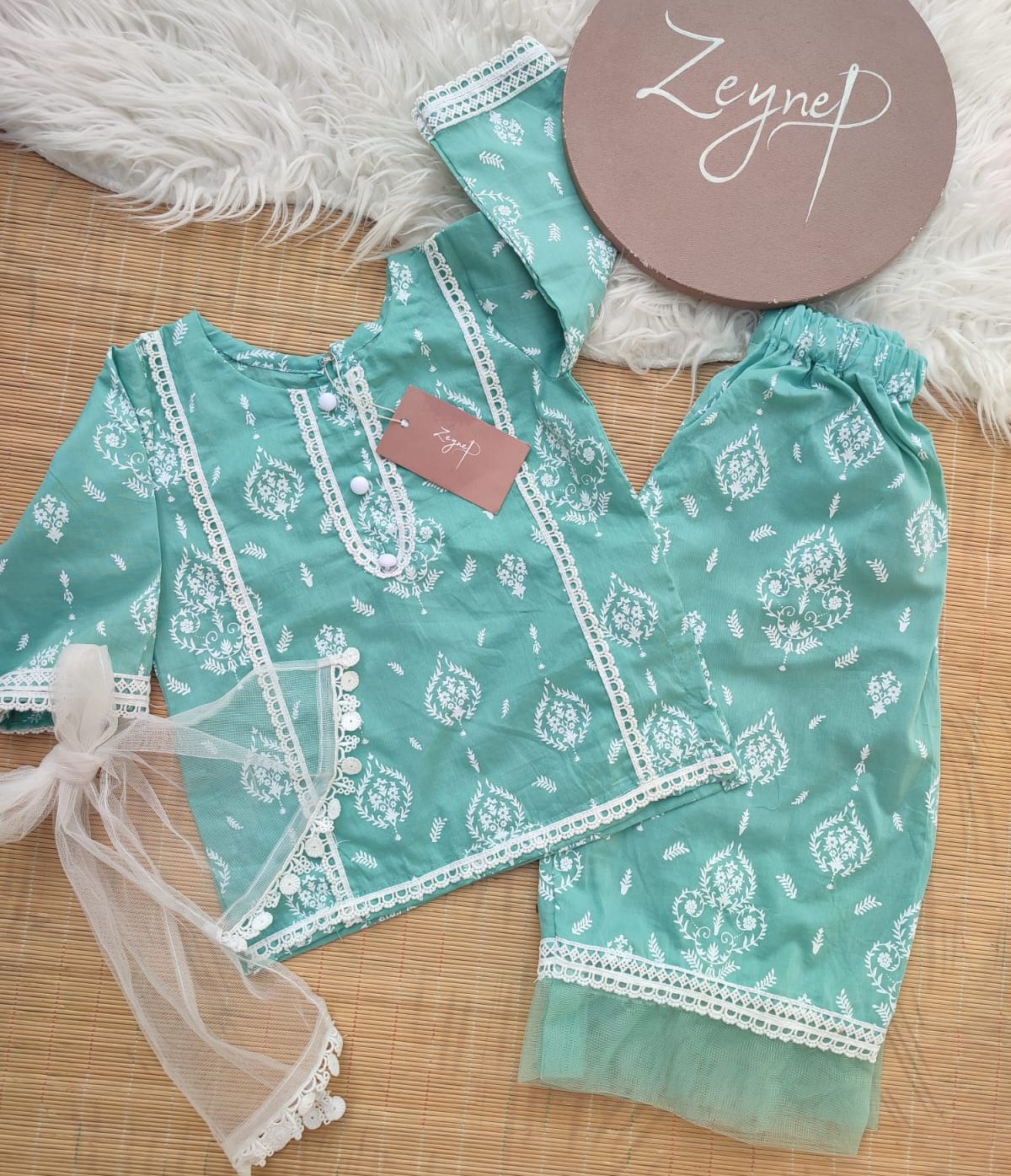 A refreshing 3-piece lawn outfit featuring a printed shirt, matching trousers, and a soft net dupatta.