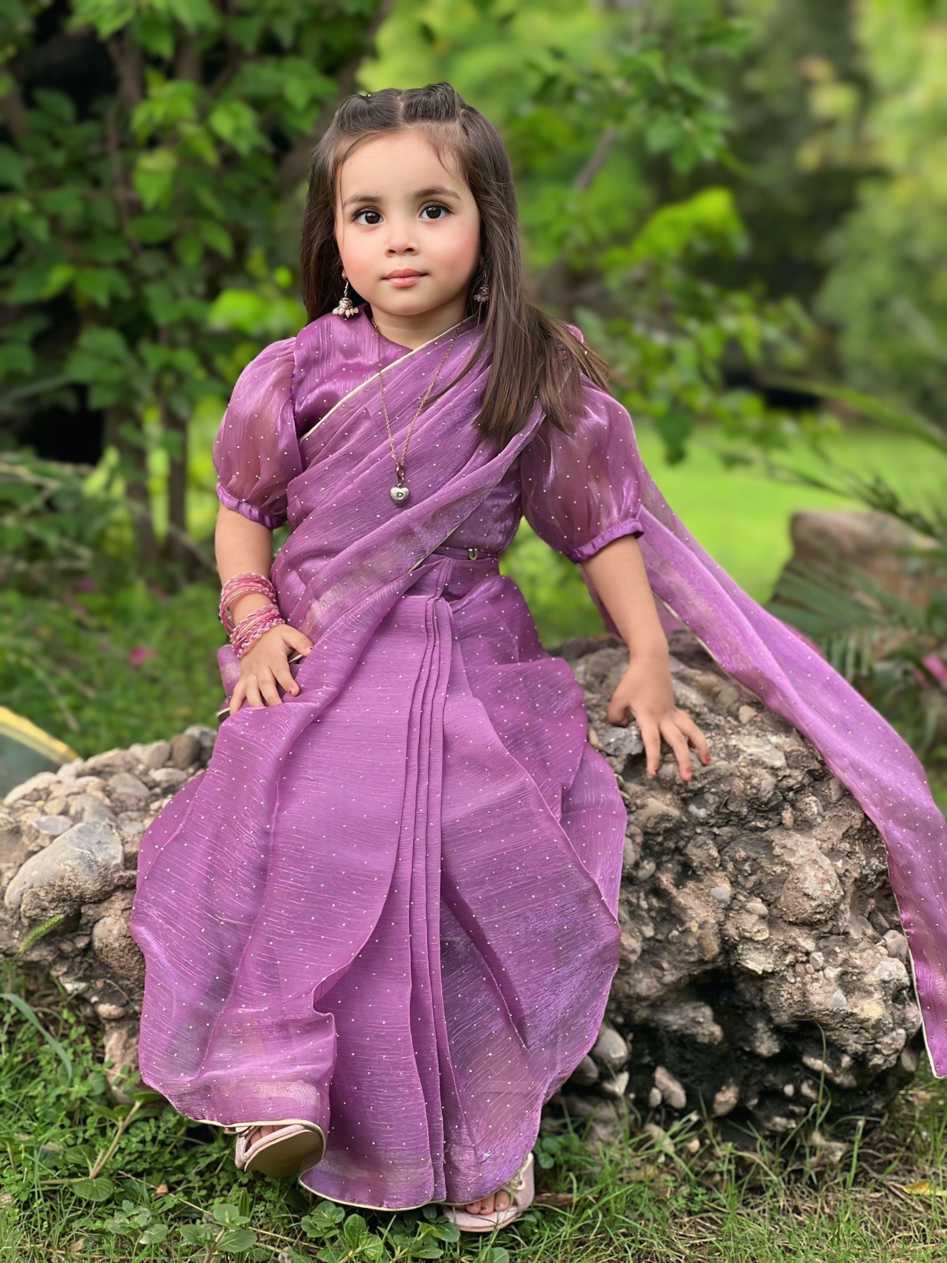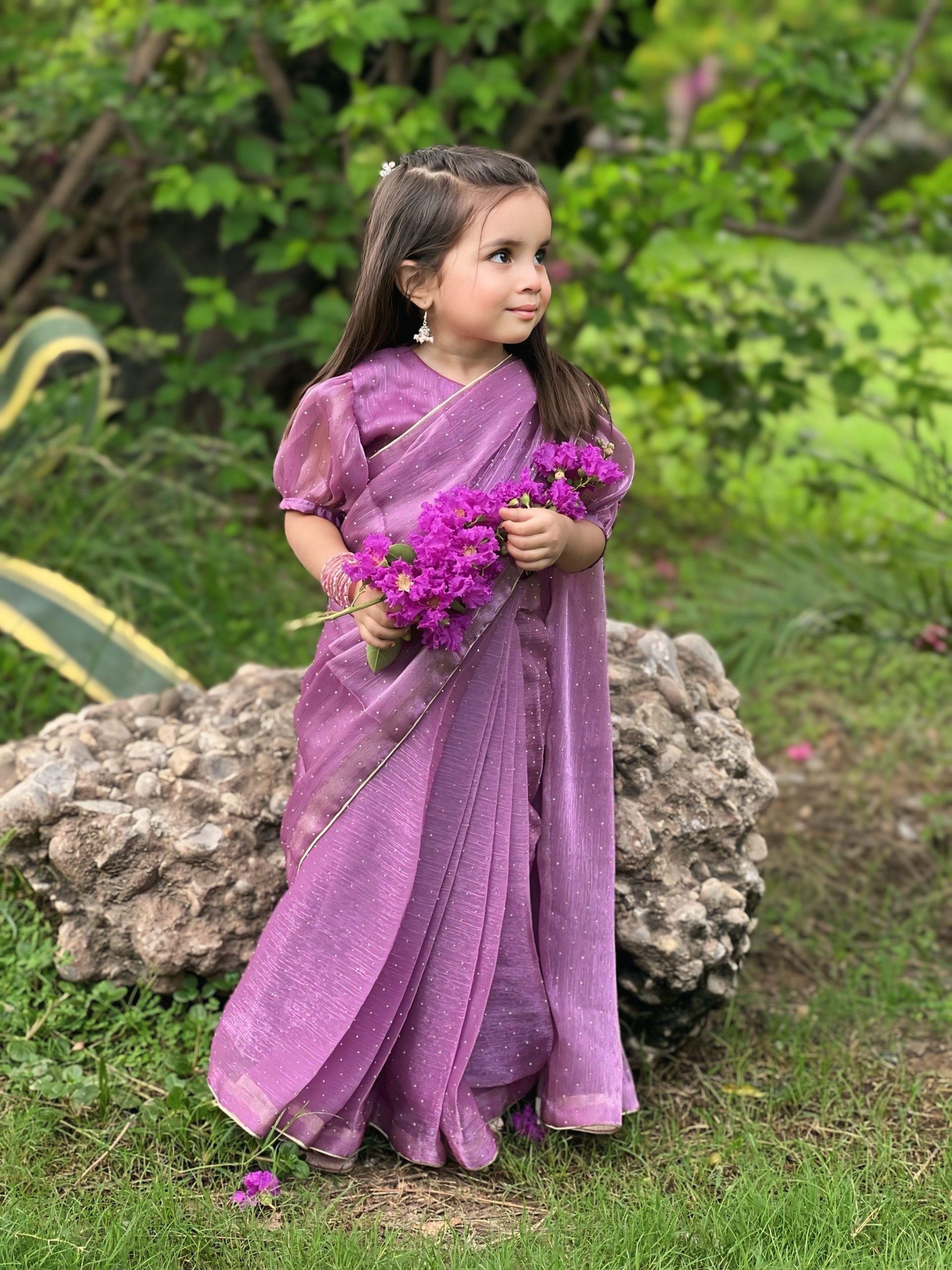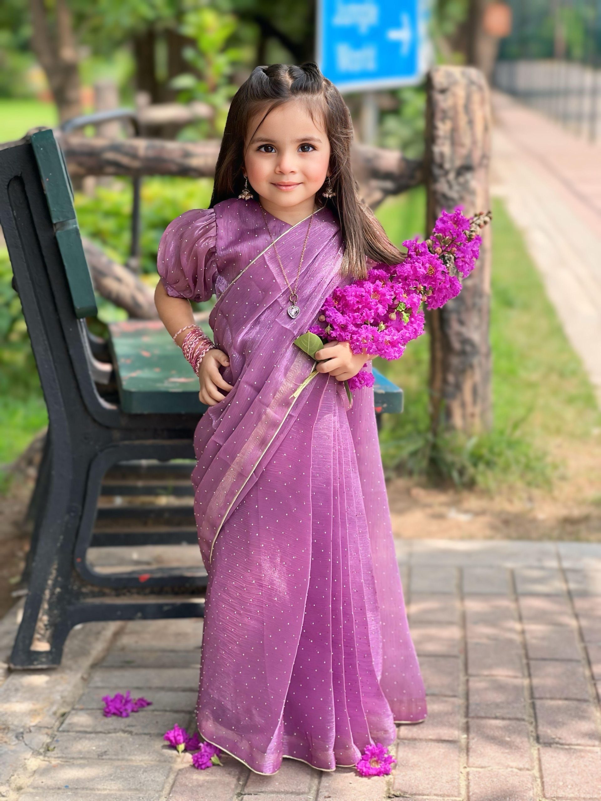 A delicate sheesha silk saree in a graceful mauve hue, blending comfort and tradition. Soft, lightweight, and perfect for kids — made to order in any size.