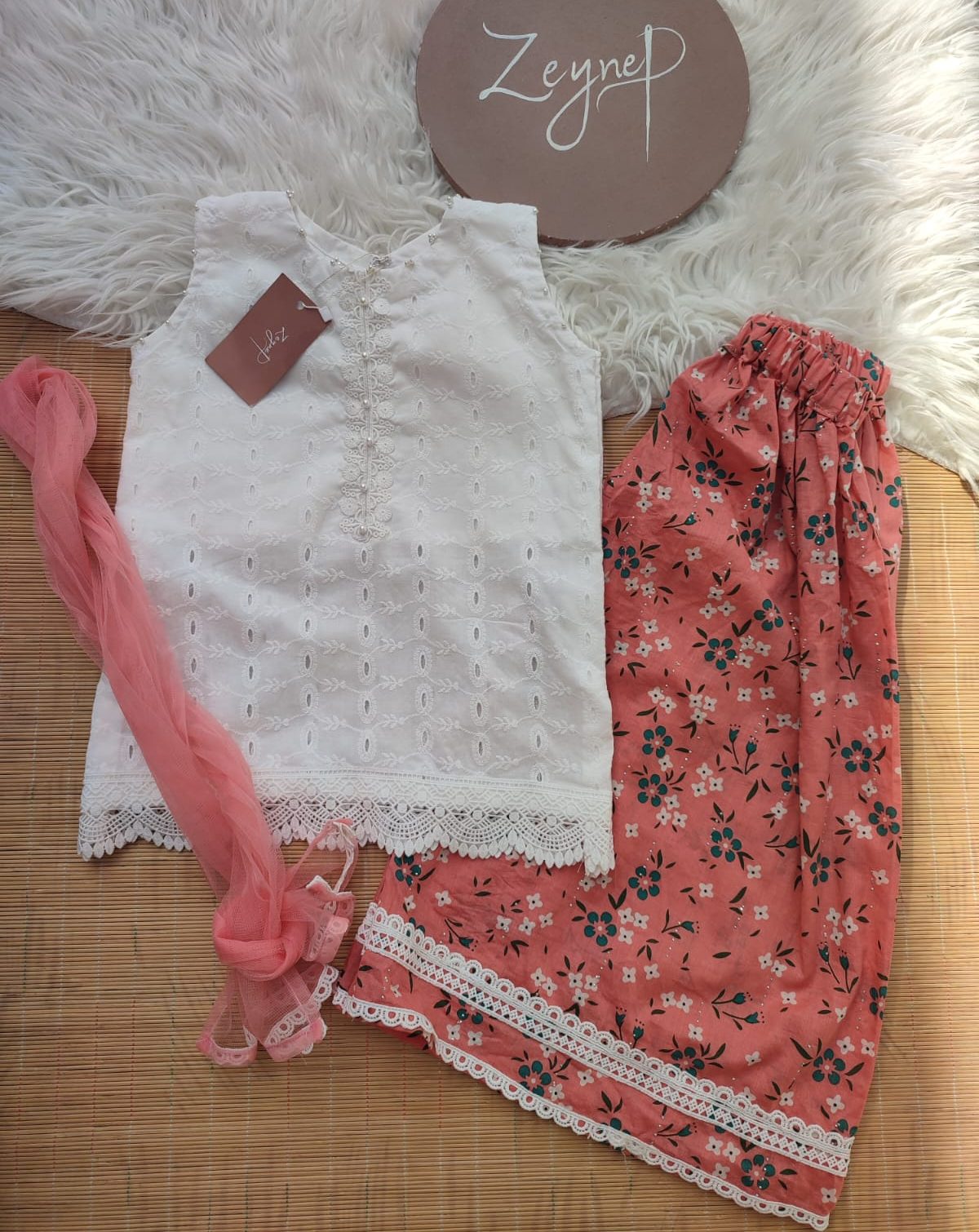 A delicate 3-piece outfit featuring a chicken kari shirt with pearl detailing, paired with printed lawn trousers and a soft net dupatta.