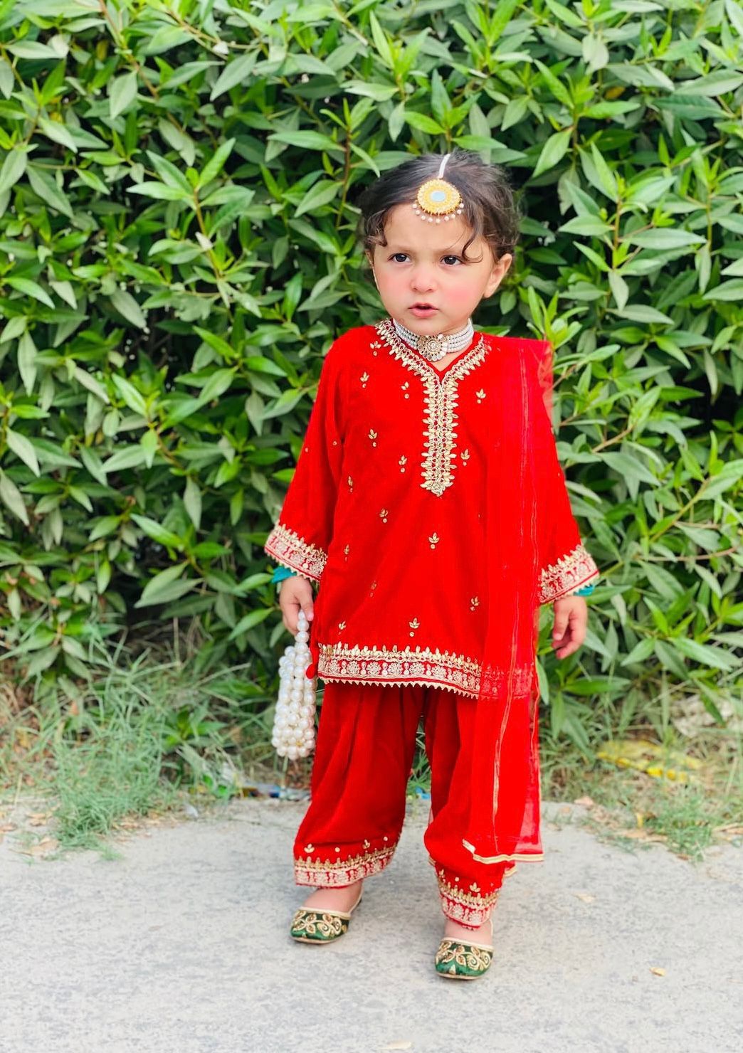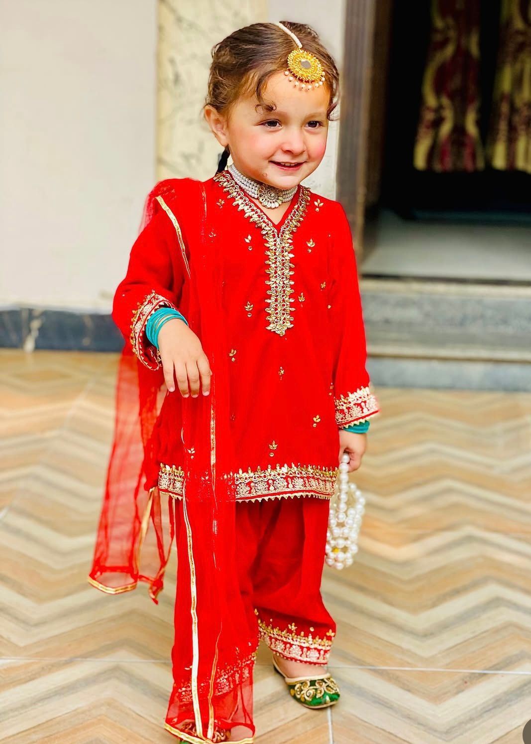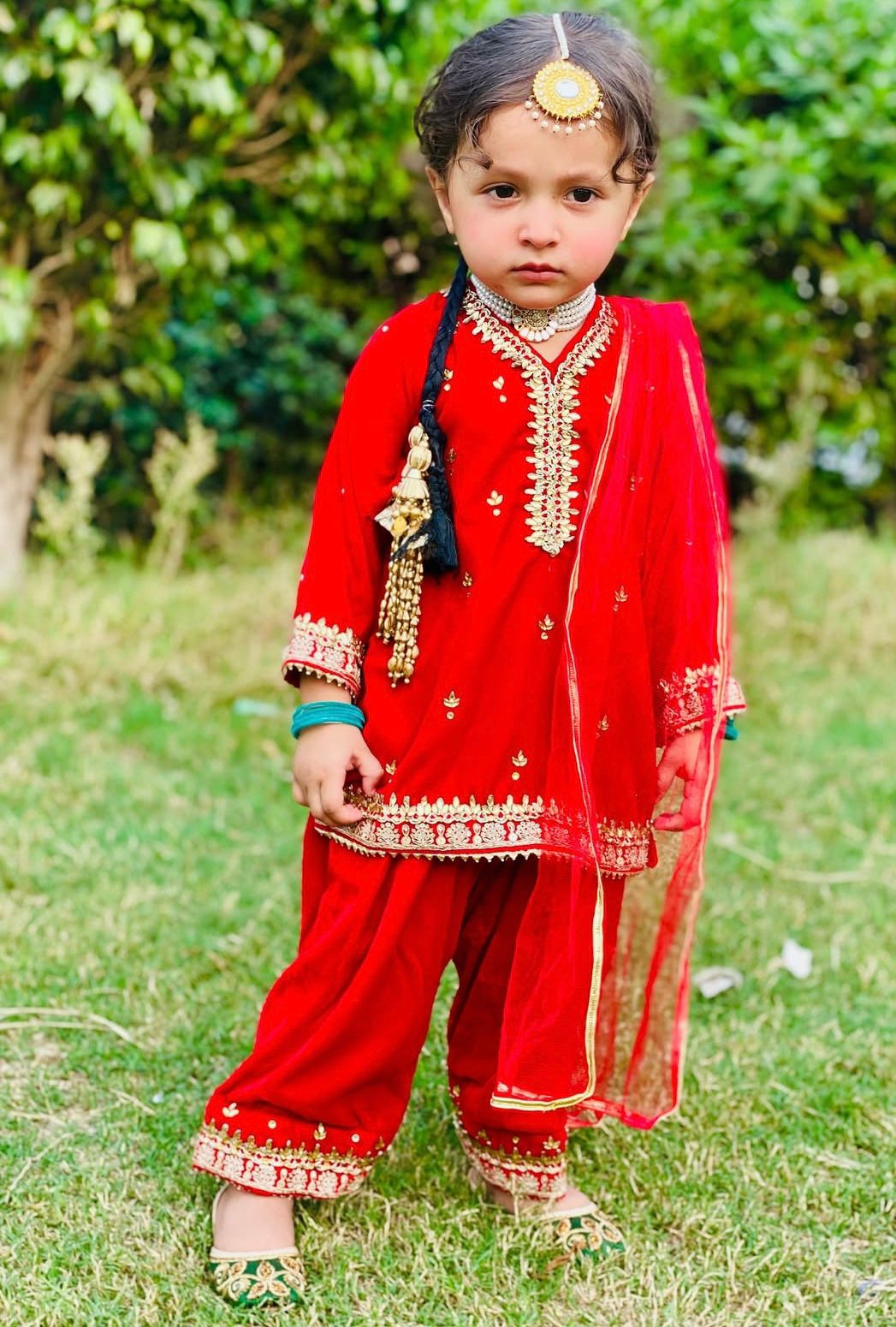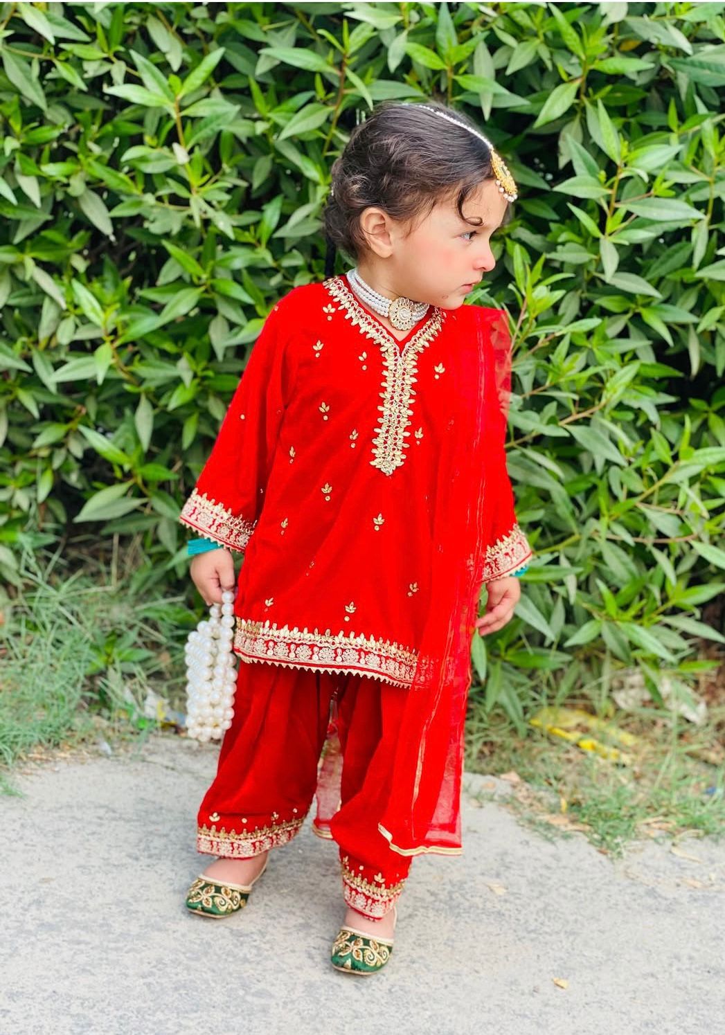 The Laal Noor Velvet Suit is a beautiful celebration of tradition and elegance. Crafted from rich red velvet, the outfit is enhanced with intricate lace detailing along the neckline, sleeves, and borders, adding refined charm. Paired with a lightweight net dupatta, this ensemble offers a perfect balance of richness and grace. Ideal for weddings, festive occasions, and cultural celebrations, Laal Noor is designed to make little ones shine with classic beauty.