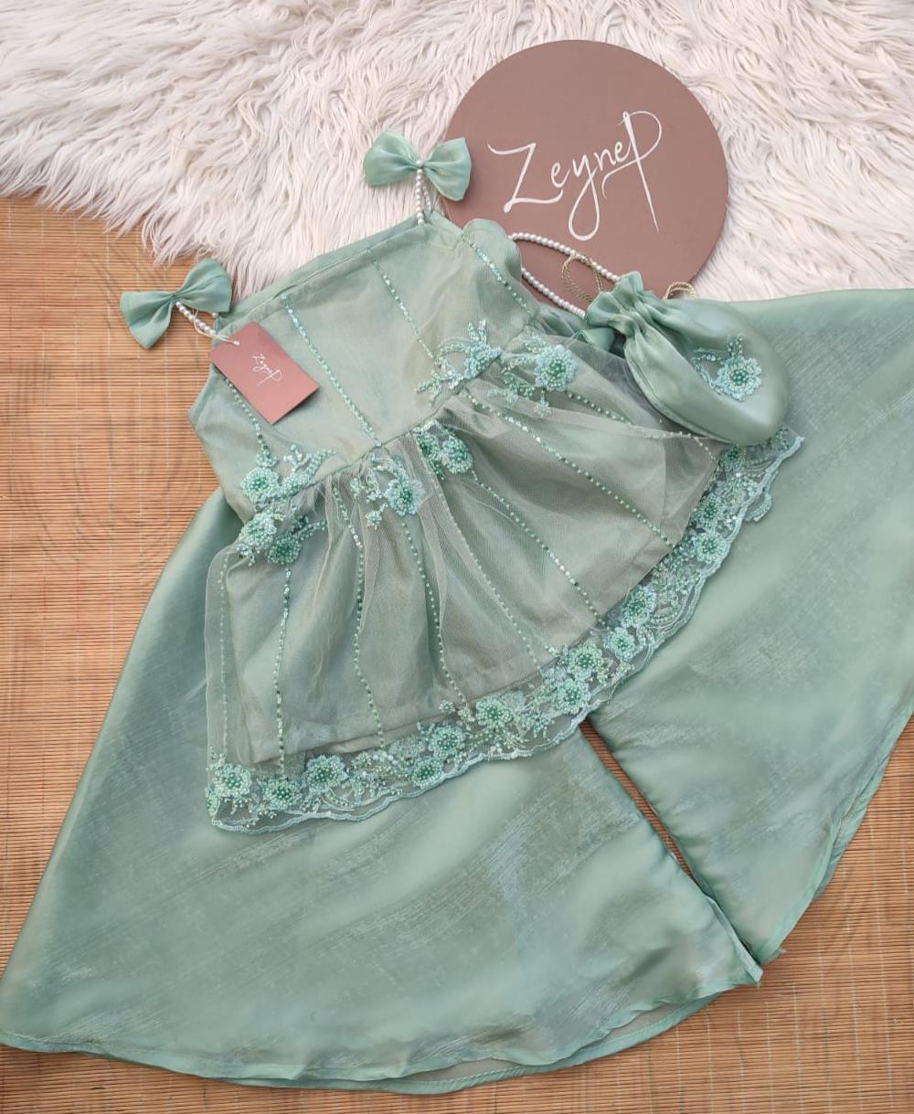The Mint Elara Sheesha Set is a graceful 3-piece outfit crafted to give a delicate and elegant look. The beautifully embellished net shirt features intricate floral embroidery with pearl-style detailing, layered over smooth sheesha silk lining for a rich yet comfortable finish.