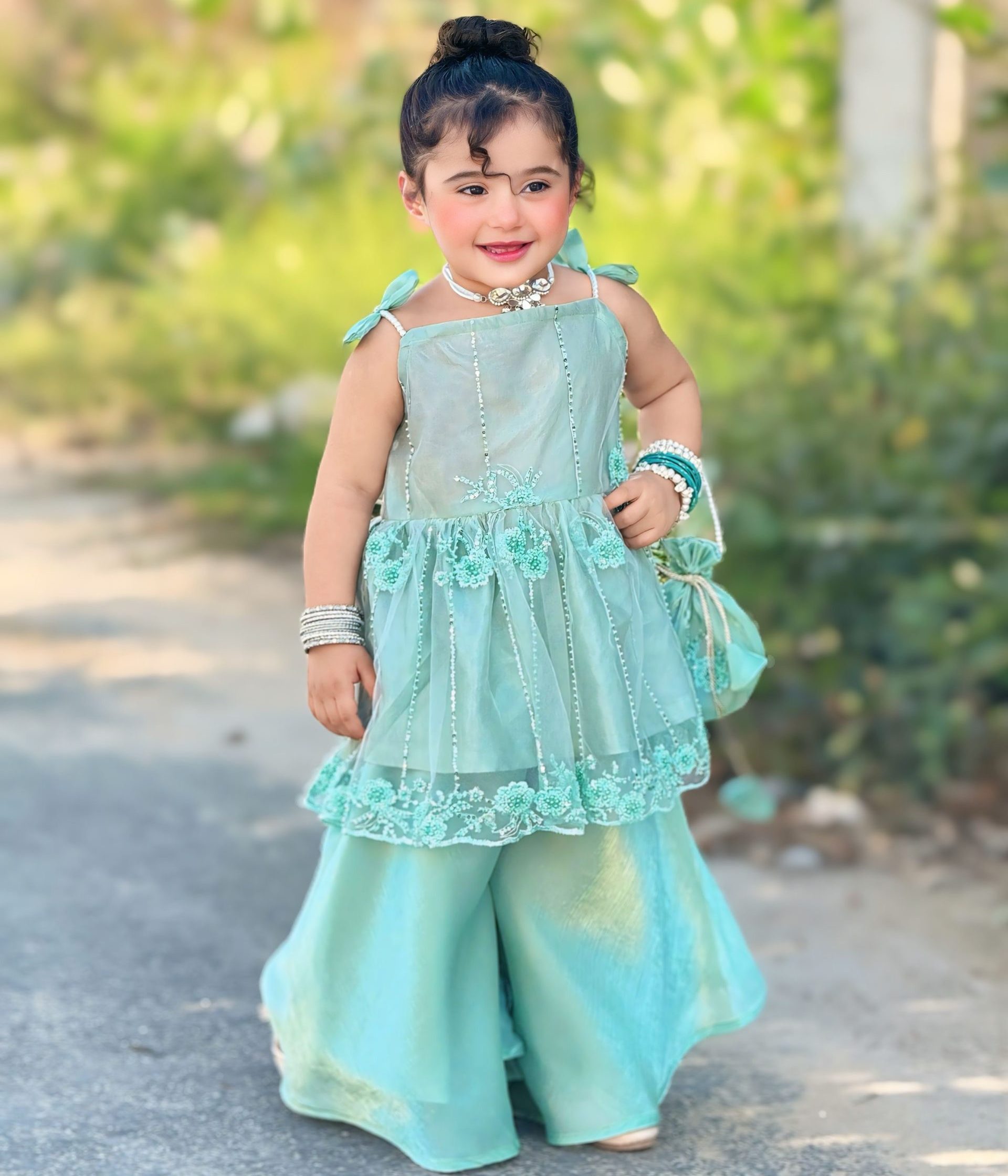 The flared gharara in sheesha silk adds volume and flow, creating a timeless traditional silhouette with modern sophistication. Completing the set is a coordinated embellished potli bag that adds a charming festive touch.