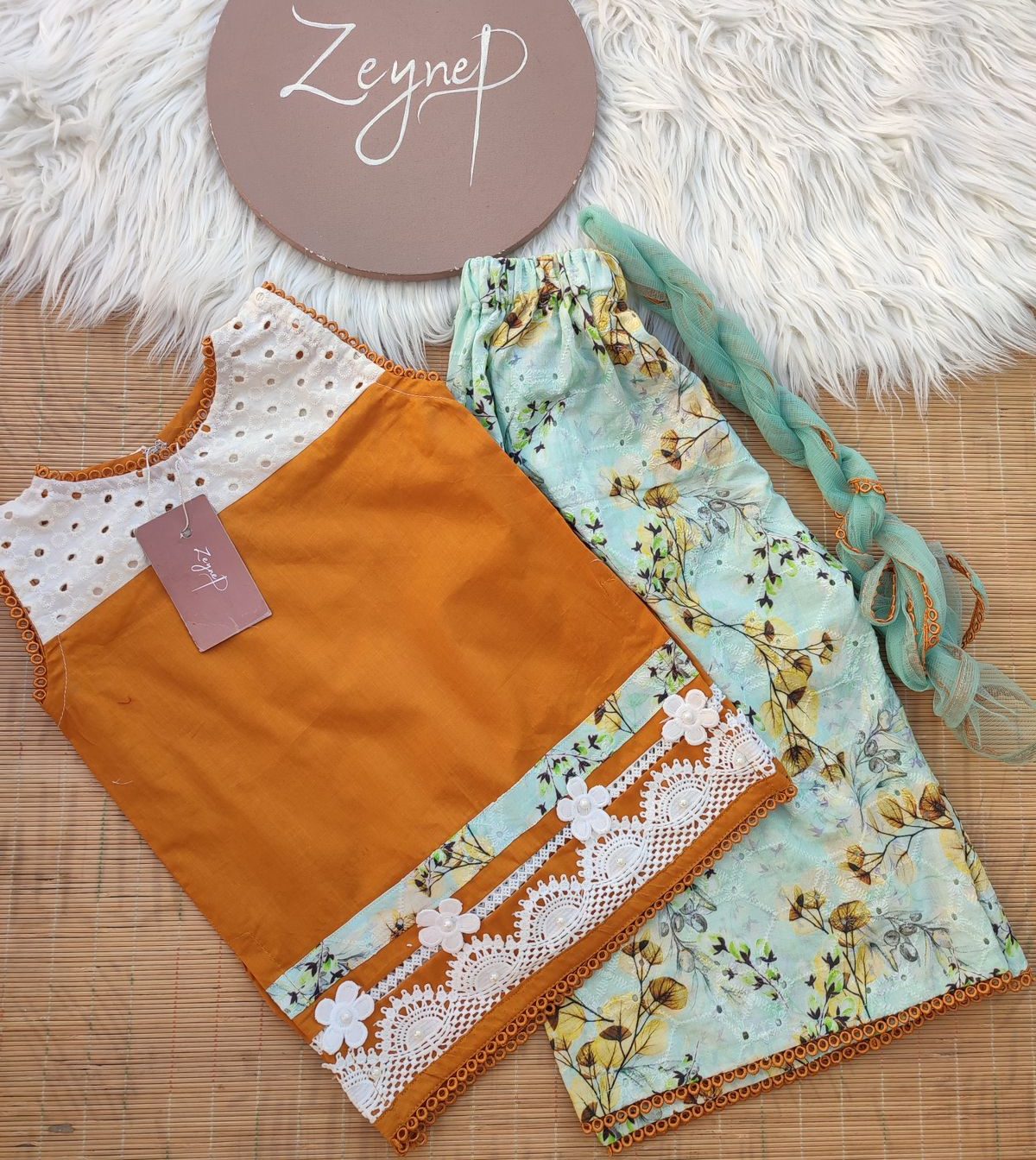 A lively and refreshing ensemble designed for summer charm. The lawn shirt in a rich marigold hue is beautifully enhanced with intricate chicken kaari detailing on the neckline, adding a touch of elegance. It is paired with a soft, flowy printed lawn plazo in soothing mint tones, creating a perfect contrast of colors. The look is completed with a lightweight net dupatta, adding grace and airiness to the outfit. Ideal for casual wear, day outings, and festive summer gatherings, this set blends comfort with effortless style.