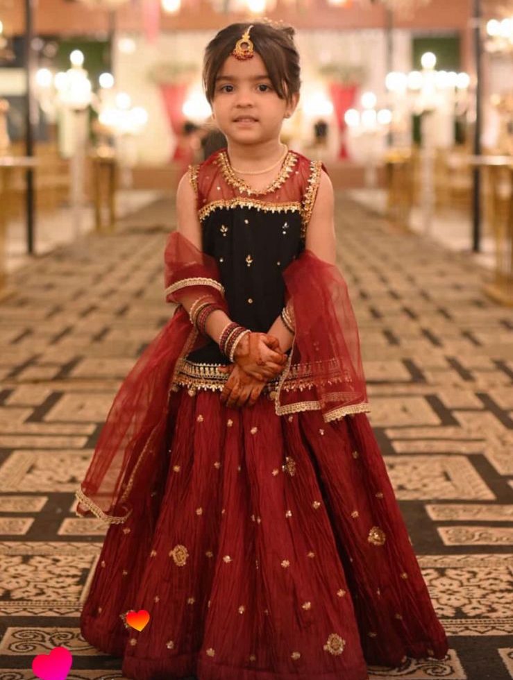 Paired with a flowy crush lehnga, the outfit creates volume and movement, giving it a festive and regal presence. A matching net dupatta completes the ensemble, adding softness and balance while elevating the overall silhouette.