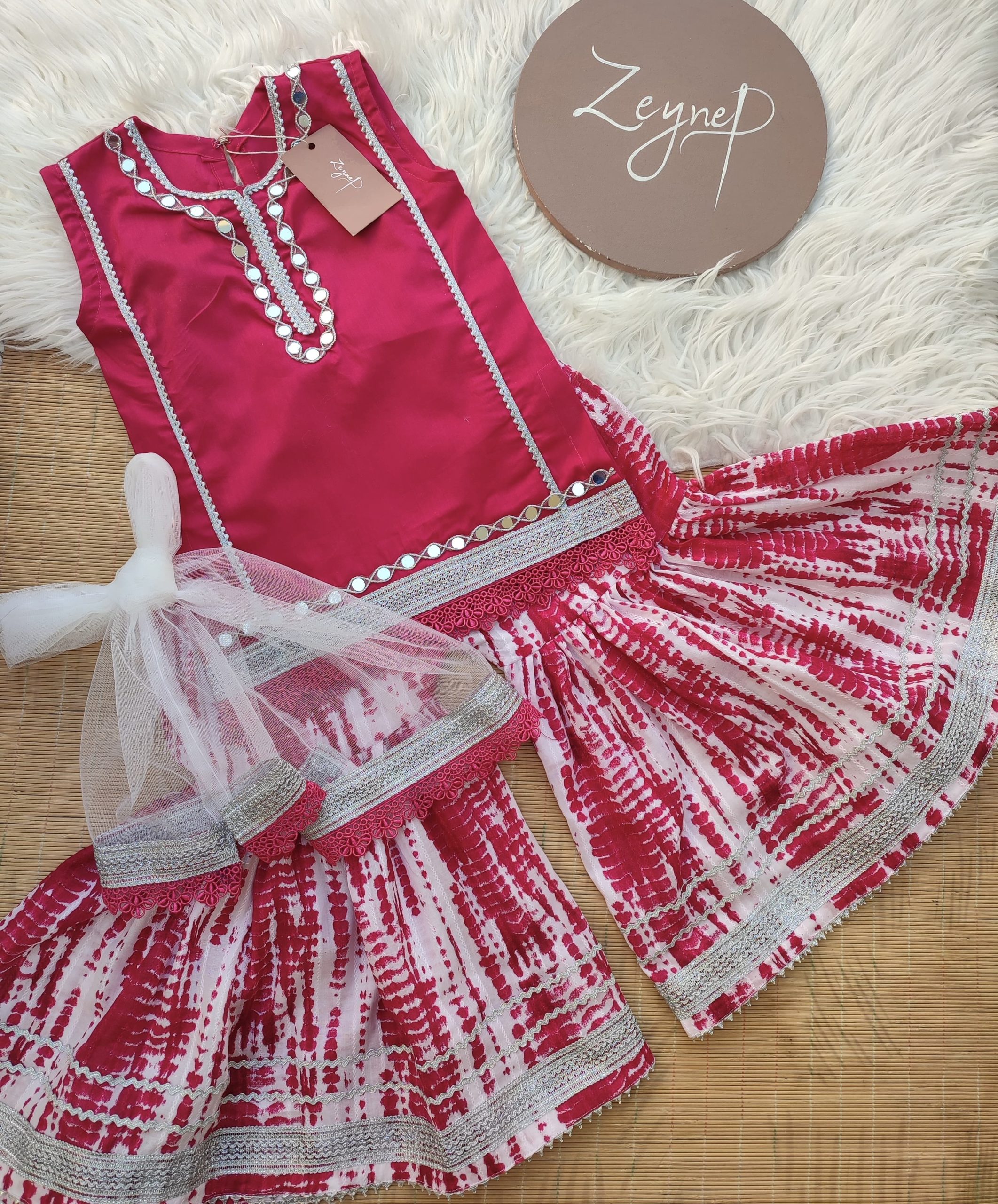 Stylish lawn gharara set featuring a vibrant ruby pink shirt paired with a beautifully flared printed lawn gharara and soft net dupatta. Perfect for festive wear and special occasions.