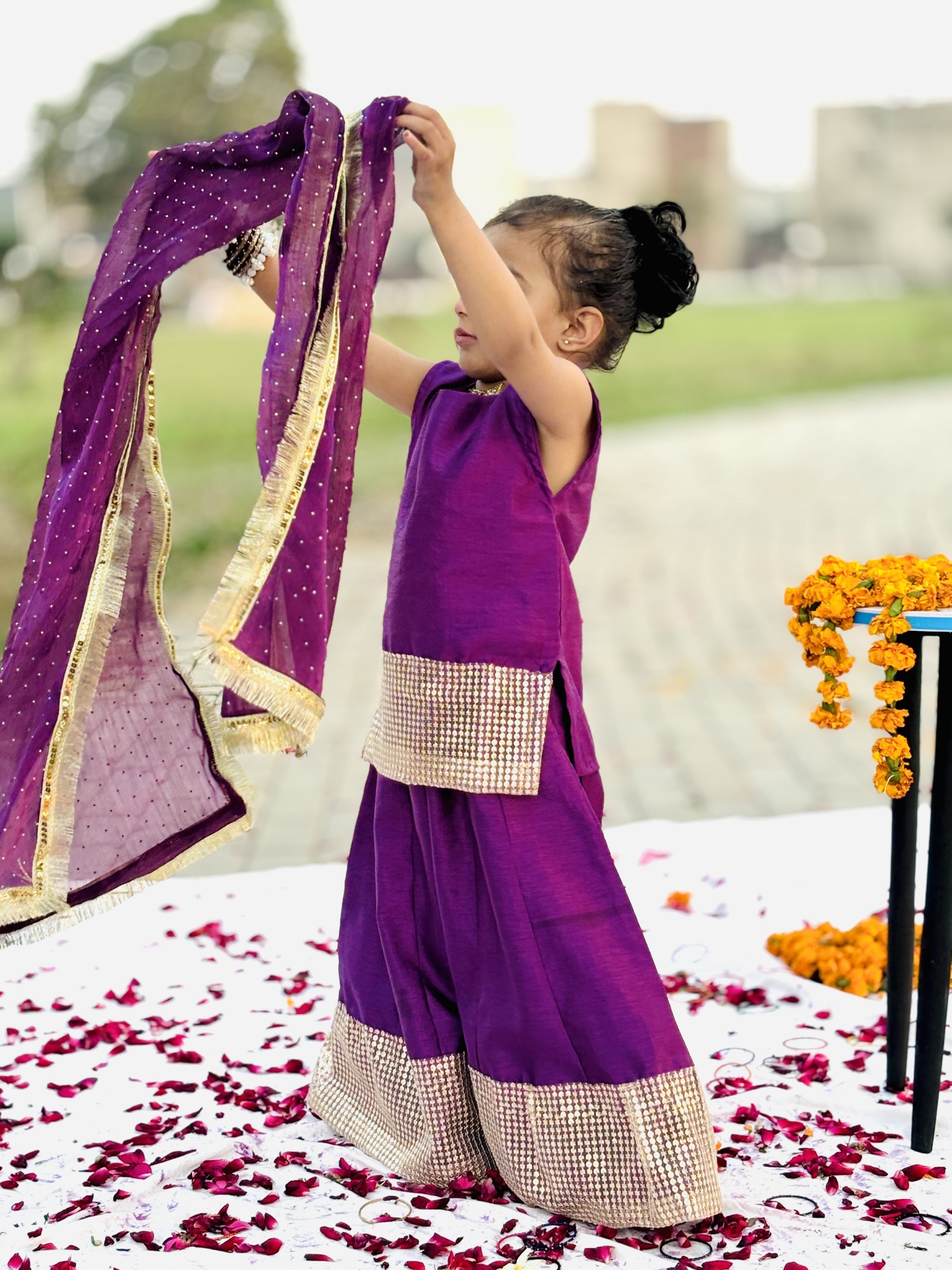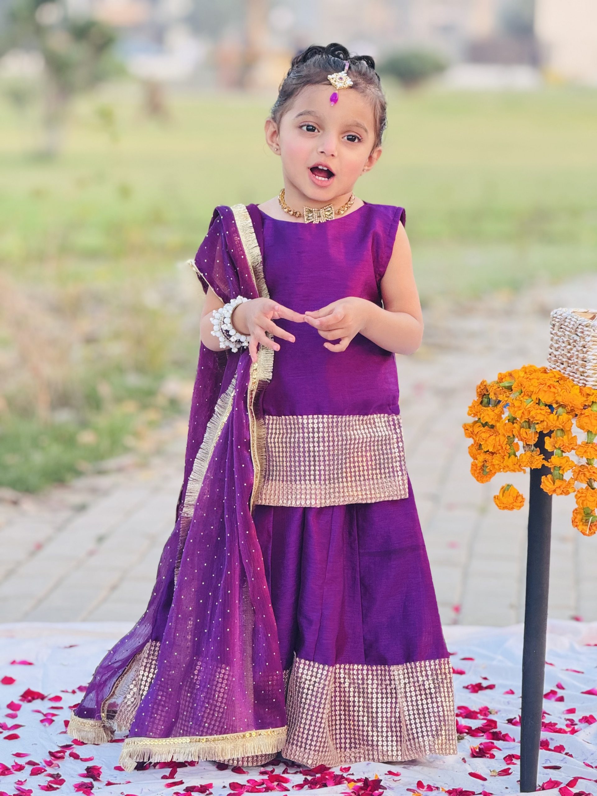 A refined raw silk shirt paired with a flowing sharara and a lustrous sheesha silk dupatta, beautifully accented with shimmering borders for a timeless festive look.