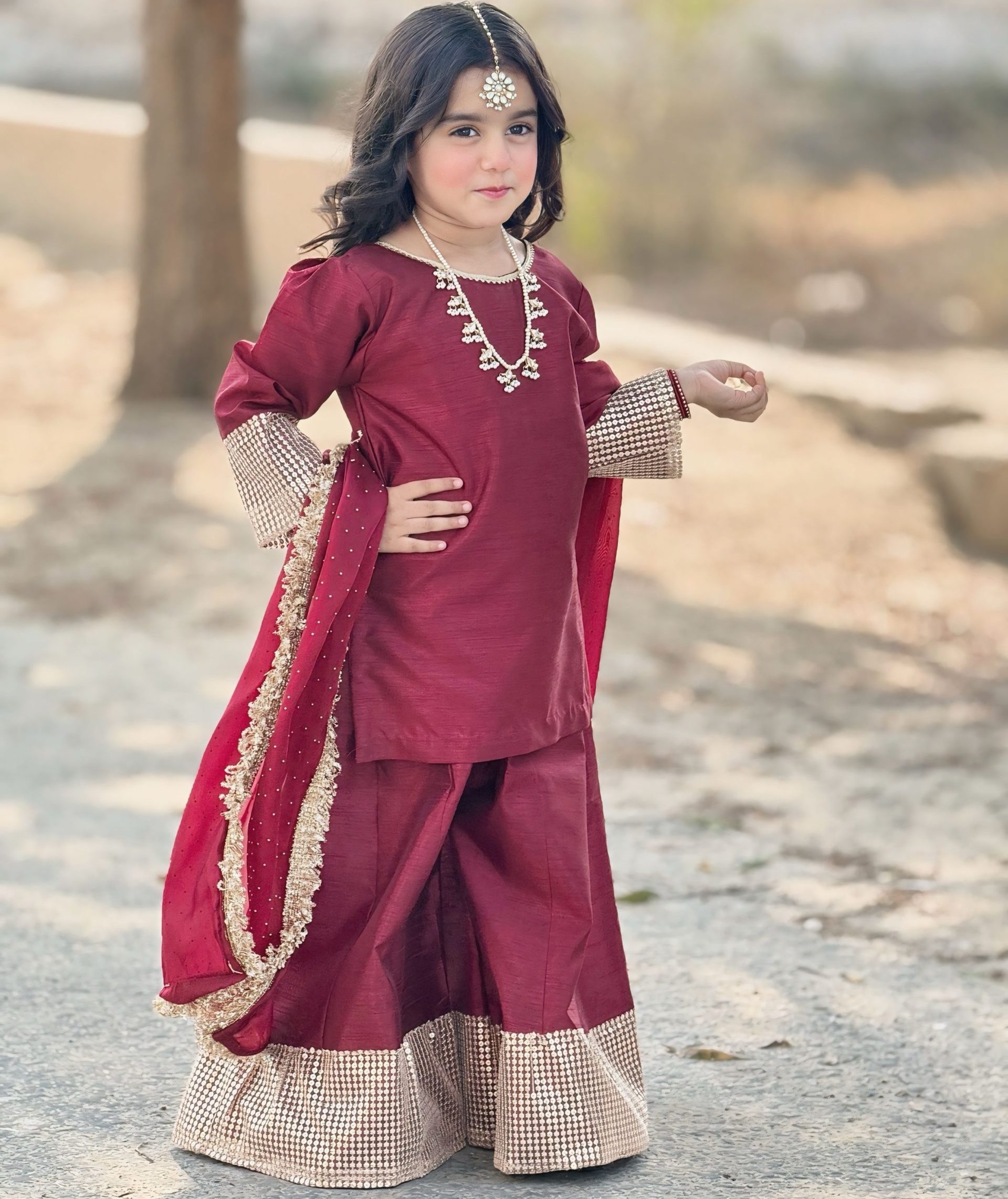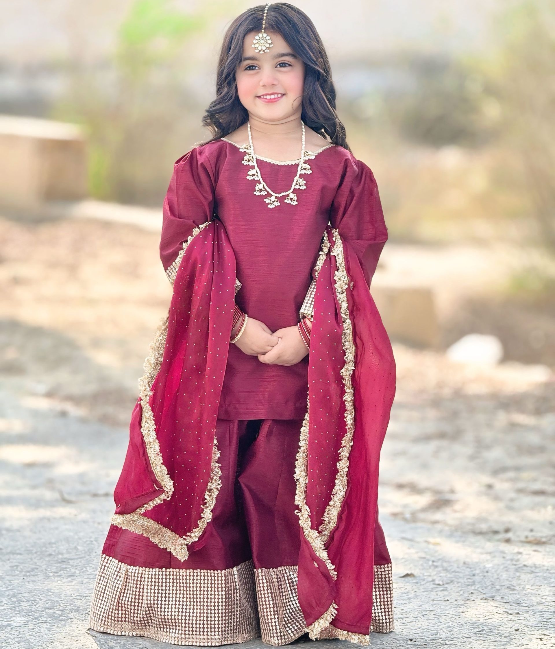 | Product Description | A refined raw silk shirt paired with a flowing sharara and a lustrous sheesha silk dupatta, beautifully accented with shimmering borders for a timeless festive look. |