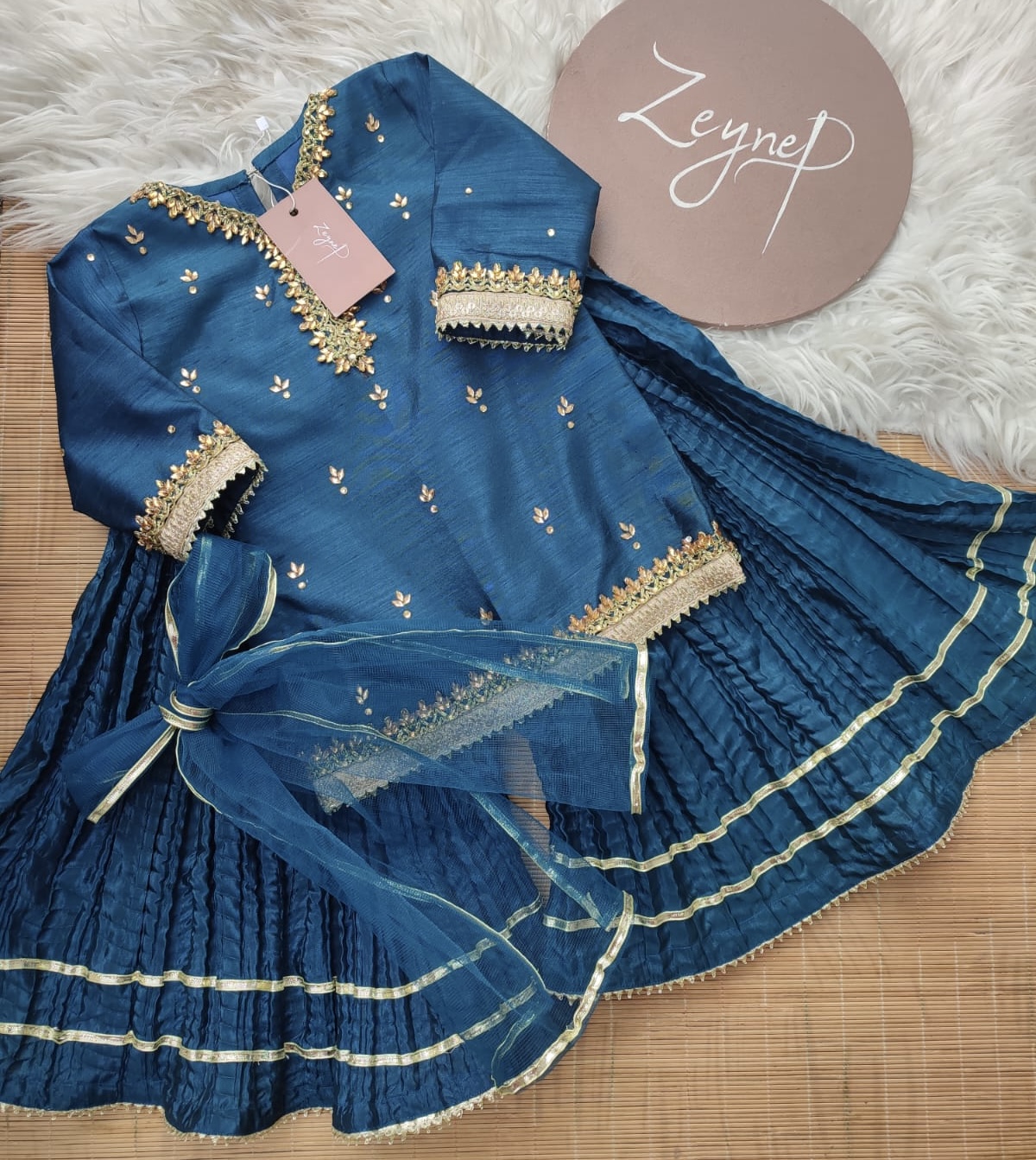| Product Description | A graceful crush sharara paired with a raw silk shirt adorned with lace and stone spray, finished with a soft net dupatta. |